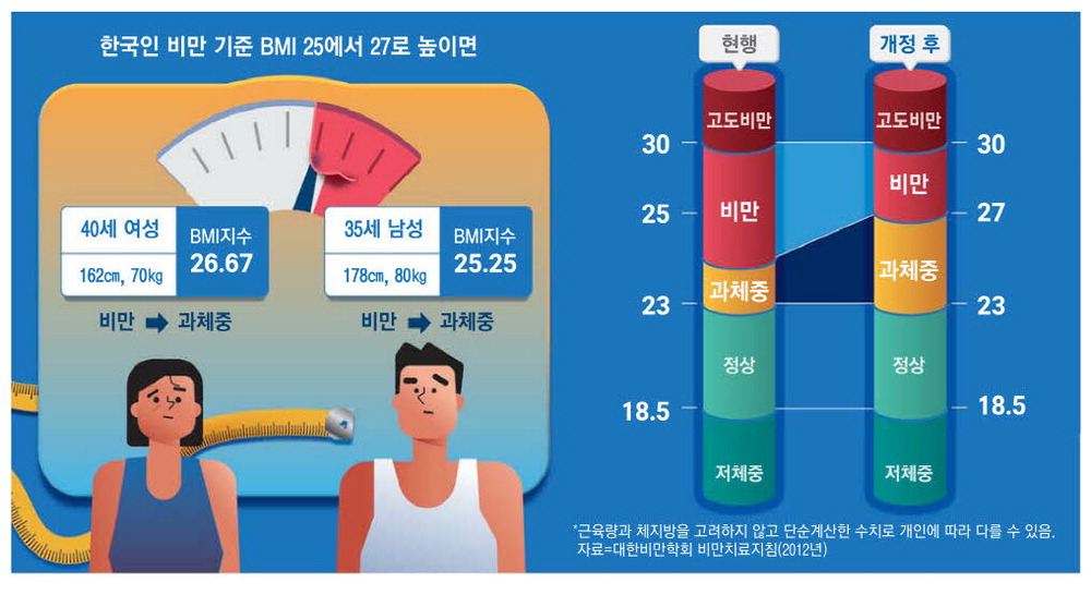 우리나라의 경우 세계보건기구(WHO) 서태평양지역 기준에 따라 BMI가 18.5~22.9 사이면 '정상',23~24.9이면 '비만 전 단계'(위험체중·과체중),25 이상이면 '비만'으로 분류한다. 비만 판정 기준을 27로 높이면 키 162㎝·몸무게 70㎏ 여성과 키 178㎝·몸무게 80㎏ 남성도 '뚱뚱'이 아닌 '통통'으로 보아야 한다.