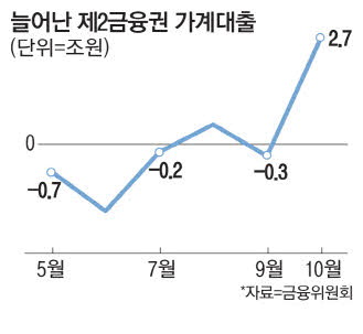 11일 금융위원회·금융감독원이 발표한 가계대출 동향에 따르면 지난달 금융권 전체 대출은 6조6000억원 늘어 9월(5조3000억원)에 비해 증가 폭이 커졌다. 은행 대출은 전월 대비 줄었지만 카드론,보험계약대출 등 서민 급전 수요가 늘어 전체 금융권 대출 증가세를 주도했다.