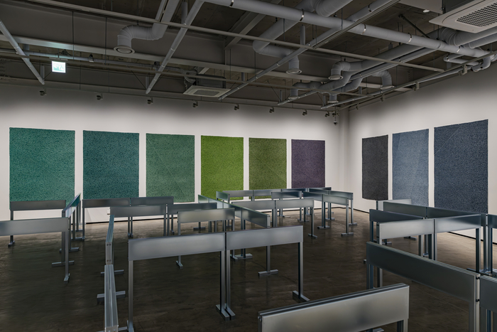 2층 전시장에서는 외부 창 전면을 덮어 자연광을 은은하게 공간 내부로 끌어들이는 박기원 작가의 ‘중정’(2024)과 바닥에 놓인 박소희 작가의 보태니컬 아트 ‘Le sol_soil’(2024)이 하나의 작품처럼 만난다. 공간을 수직과 수평의 축으로 구현된 가상의 중정으로 탈바꿈한 것이다. ‘Le sol_soil’은 1층 작품과는 반대로 위에서 아래로 내려다 보도록 시선을 전복시킨 작품이다. 조밀하게 들어선 숲을 먼 곳에서 조망하는 것 같은 이 작업은 ‘COMPLEX_root’와 마찬가지로 통상적인 플라워 디자인 작업 과정에서 버려지는 재료들을 활용했다. 박소희 작가는 “건물이 완성되기 전부터 인근을 산책하면서 작품을 구상했고,도안을 미리 정해두지 않고 설치하는 과정에서 공간에 맞춰 완성했다”고 설명했다.