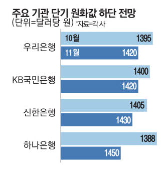하락세가 가팔라지면서 은행들도 속속 원화값에 대한 눈높이를 낮춰잡고 있다. 지난달에 비해 20~60원씩 낮아졌다. 하나은행은 이달 원화값이 1450원까지 내려갈 수 있다고 봤고,신한은행은 1430원선에서 바닥을 형성할 것으로 분석했다.