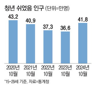 지난달 '쉬었음' 청년은 41만8000명으로 전년 동월 대비 5만2000명(14.3%) 증가한 것으로 나타났다. 10월 기준으로 볼 때 코로나19 위기였던 2020년 이후 4년 만에 최대치다.