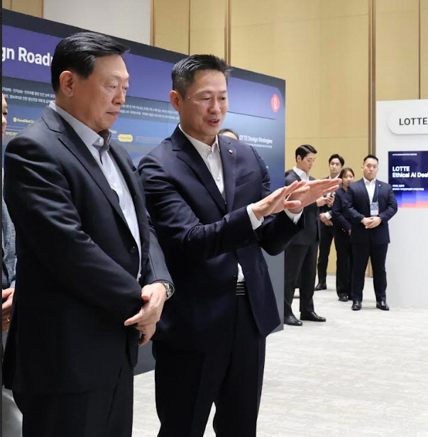 신동빈 롯데 회장(왼쪽)과 이돈태 롯데지주 디자인전략센터장이 롯데 디자인의 미래라는 주제로 마련된 전시 부스를 살펴보고 있다. 롯데지주