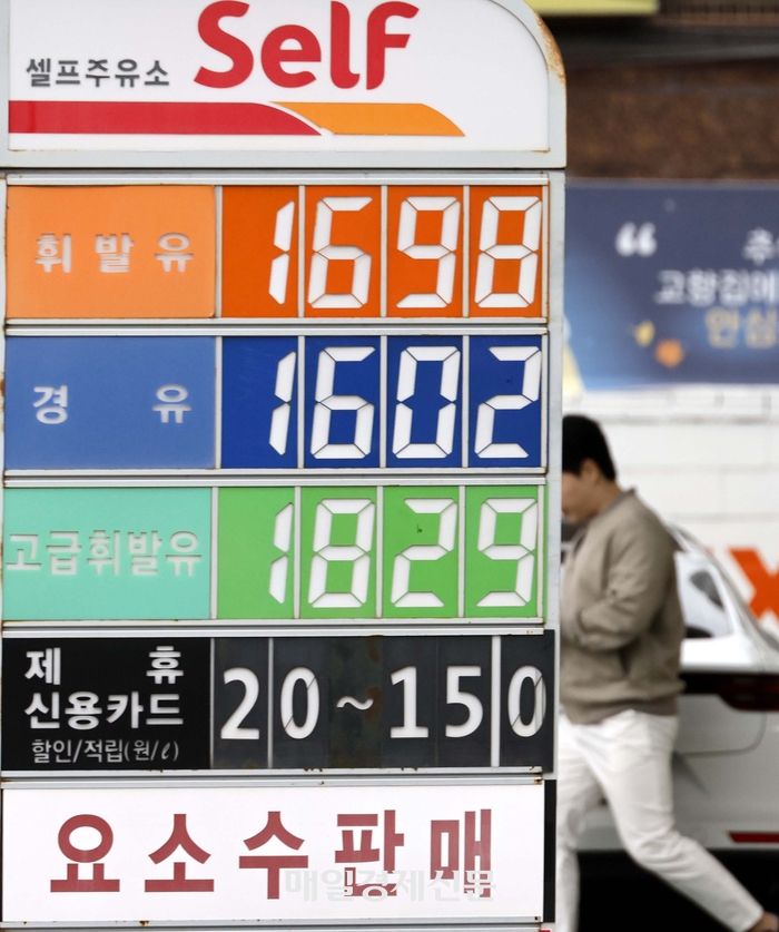 이번 주 국내 주유소 휘발유와 경유의 주간 평균 가격이 5주 연속 동반 상승한 가운데 17일 서울의 한 주유소에 유가정보가 표시되어있다.