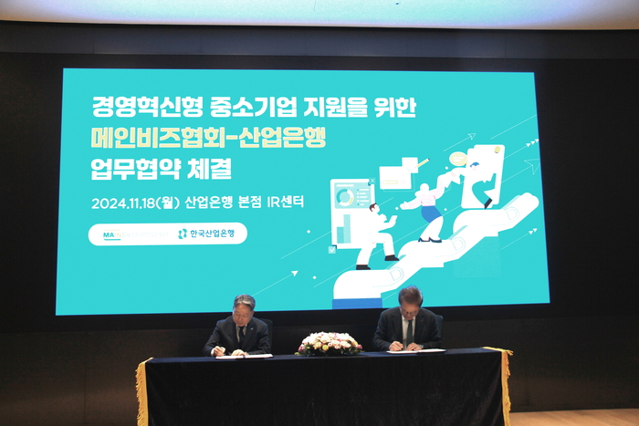 협약식에는 김명진 메인비즈협회장과 강석훈 KDB산업은행 회장을 비롯한 두 기관 관계자들이 참석했다. 김 회장은 “산업은행은 기술력과 사업성을 가진 중소기업을 글로벌 중견기업으로 육성하고자 온렌딩 대출·투자·컨설팅을 비롯한 다양한 프로그램을 지원하는 중소기업의 든든한 성장 파트너”라며 “이번 협약을 계기로 메인비즈기업을 향한 금융·컨설팅 지원을 강화해 양 기관이 한국 경제 혁신성장을 선도해 나가기를 기대한다”고 말했다. 강 회장은 “유망 중소기업에 대한 맞춤형 금융과 경영혁신 지원을 통해 중소기업이 대한민국의 미래성장 동력으로 발돋움할 수 있도록 메인비즈협회와 계속 협력해 나가겠다”고 밝혔다.
