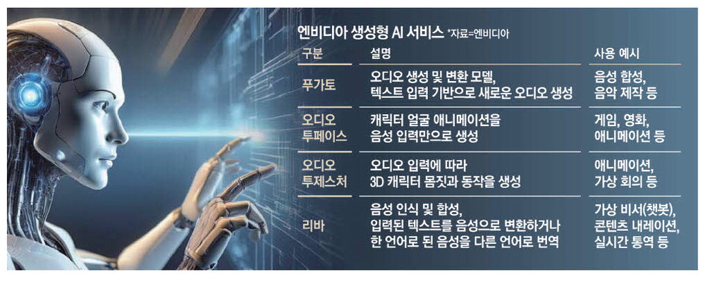 엔비디아는 푸가토 외에도 엔터테인먼트 분야에서 활용할 수 있는 생성형 AI를 선보여왔다. 캐릭터 얼굴 애니메이션을 음성 입력만으로 생성해주는 '오디오투페이스',음성 입력을 기반으로 사실적인 애니메이션을 만들어주는 '오디오투제스처',디지털 아바타 제작용 AI 서비스인 '옴니버스 에이스',음성 인식과 합성을 위한 실시간 대화형 음성 AI를 지원하는 '리바' 등이 대표적이다.
