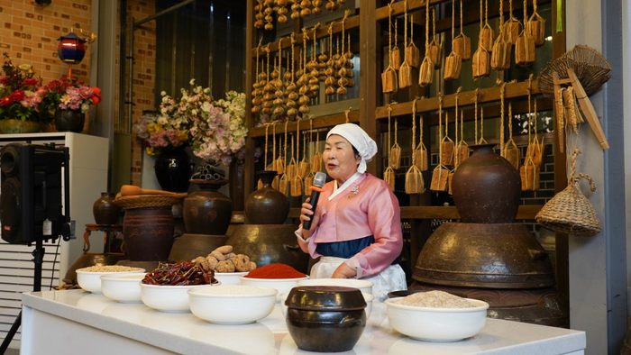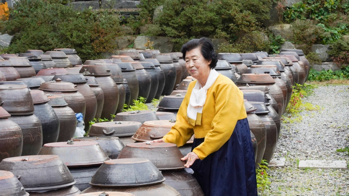 ​강순옥 명인/사진=류한나래 여행+ PD 순창장본가의 명인본가체험장으로 들어서면 메주가 잔뜩 매달린 벽과 크고 작은 옹기들이 반겨준다. 준비된 앞치마와 두건을 두르기만 해도 벌써 명인의 수제자가 된 기분이 들어 마음이 들뜬다.