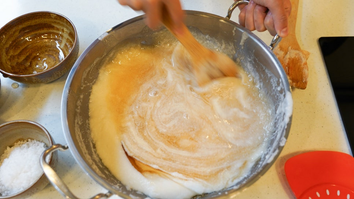 ​고추장이 만들어지는 과정/사진=류한나래 여행+ PD 고춧가루를 넣기 전까지는 아리송하던 표정의 참가자들이 고춧가루를 넣고 나서야 “아!” 하고 웃는다. 그전까지는 묽던 혼합물이 고춧가루의 성분으로 점성이 생겨 비로소 고추장의 모습을 띄기 때문이다. 고추장은 숙성 환경에 따라 맛이 쉽게 변해 만든 고추장을 집에 가져가진 못하지만 참가자들에게는 강 명인이 만든 고추장을 제공한다.