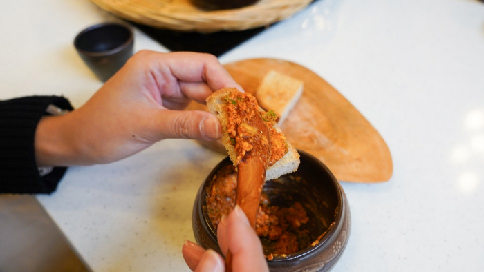 ​빵에 발라 먹는 고추장 버터/사진=류한나래 여행+ PD 말로 들었을 때는 상상이 가지 않던 고추장 버터를 실제로 먹어보니 예상보다 맵지 않고 고소한 맛이 일품이다. 채소나 쌈에 곁들여도 좋지만 바싹하게 구운 빵에 발라 먹으면 어디서도 맛 본 적 없는 새로운 맛을 경험할 수 있다. 계량에 따라 맛이 달라져 다른 참가자와 고추장 버터의 맛을 비교하는 재미도 쏠쏠하다.