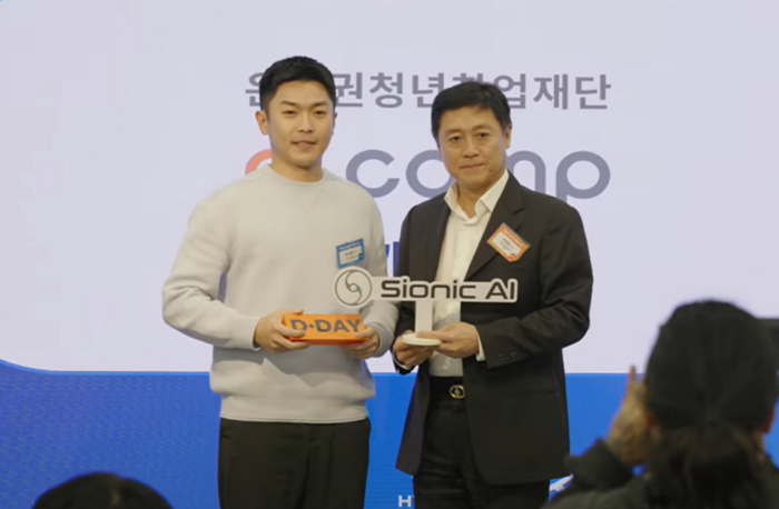 디캠프상을 받은 한시형 사이오닉에이아이 COO가 디캠프 박영훈 대표와 기념 사진 촬영을 하고 있다. 28일 은행권청년창업재단 디캠프와 제로원(ZER01NE)이 28일 공동 주최한 ‘11월 디데이 X 현대차그룹’에서 사이오닉에이아이가 대상을 받았다. 이날 함께 시상한 제로원상에는 오믈렛이 선정됐다.