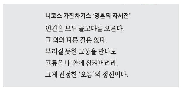 카잔차키스가 주목한 예수의 성취를 압축하는 말은 '오름'이다. 후대의 인간인 우리가 저 '오름'의 자세를 배워야 한다는 것. 고통 속에서도 자신만의 골고다 언덕을 오르기,그럼으로써 자신이 믿는 하나의 절대와 대면하기. 그게 카잔차키스가 말하는 오름의 정신이었다.