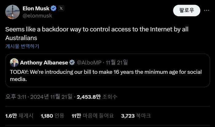 지난 21일 머스크는 자신의 X에 앨버니지 호주 총리가 청소년들의 SNS 사용을 규제하는 법안을 입법하겠다고 발표한 소식을 전하며 “모든 호주인들의 인터넷 접속을 통제하는 백도어로 보인다”고 꼬집었다. [X] 정부 차원의 규제 뿐 아니라 관련 기업들의 자발적인 제한까지 이어지면서 이용자들 사이에서 혼란을 일으키는 상황도 생기고 있다.
