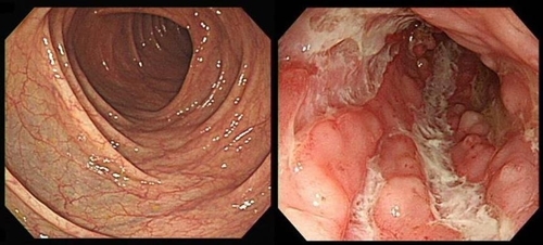 대장 내시경 사진. 왼쪽이 정상,오른쪽이 크론병.[사진 제공 = 연합뉴스] 난치질환인 염증성 장질환과 관련해 최근 젊은 사람들의 유병률이 높아지고 있다. 사실상 완치가 어렵지만 관리가 잘 된다면 일상생활을 하는데 있어 큰 문제가 없기 때문에 치료 계획을 잘 세우는 게 무엇보다 중요하다고 전문가들은 말한다.