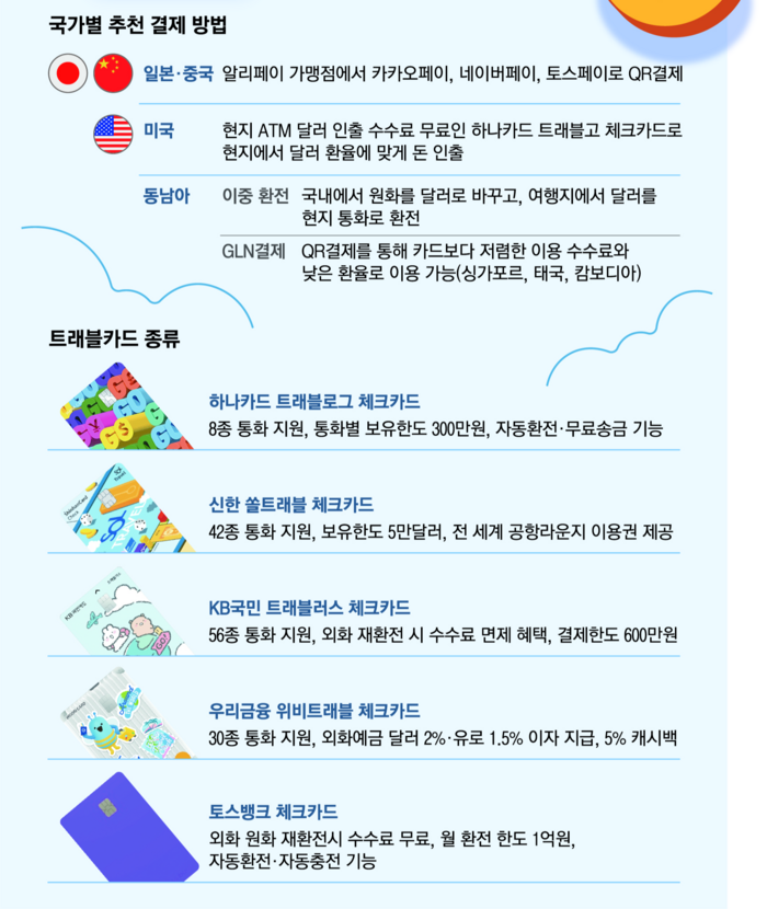 현지 실물 통화를 지갑에 넣어두는 것보다 어쩌면 더 중요해진 것은 트래블카드다. 금융사들이 저마다 트래블카드를 출시하면서 경쟁이 붙어 소비자들은 이전보다 다양한 혜택을 누릴 수 있다. 공통으로 제공하는 무료 환전과 출금 수수료 면제 기능뿐 아니라 환전 외화 이자 비용 지급,잔액 부족 시 자동 환전,공항라운지 이용권 제공 등 다양한 서비스가 마련돼 있어 내게 필요한 혜택을 주는 카드를 선택해 만들면 된다.