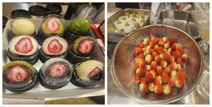 딸기모찌 모형(왼쪽)과 실제 딸기모찌에 사용되는 딸기가 작황 부진으로 크기가 작다. 이 업체는 크기가 작은 딸기 때문에 딸기모찌 1개를 만들 때 딸기를 2~3개 사용하고 있다.[사진 제공 = 전종헌 기자] 딸기를 주요 재료로 사용하는 디저트 업계도 울상이다.