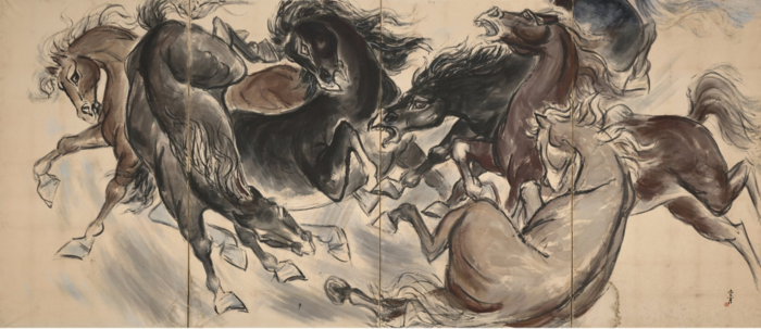 쉬베이홍의 ‘전마’ 때문인지 운보 김기창의 1955년작 ‘군마’가 먼저 눈에 어른거린다. 서로를 희롱하듯 엉킨 여섯 필의 말들은 바라보는 것만으로도 포효소리를 들어버린 것만 같다.