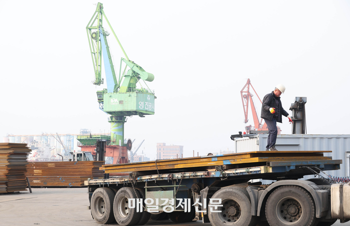 중국산 철강재의 주요 수입로인 인천항에서 2일 한 물류 담당자가 ‘메이드 인 차이나(MADE IN CHINA)’라는 글귀가 적힌 중국산 후판이 앃여있다. 이충우 기자 2024.12.02[이충우기자]
