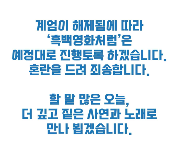 이승환은 4일 자신의 인스타그램에 “계엄이 해제됨에 따라 ‘흑백영화처럼’은 예정대로 진행토록 하겠다. 혼란을 드려 죄송하다”고 콘서트 재개를 알렸다.