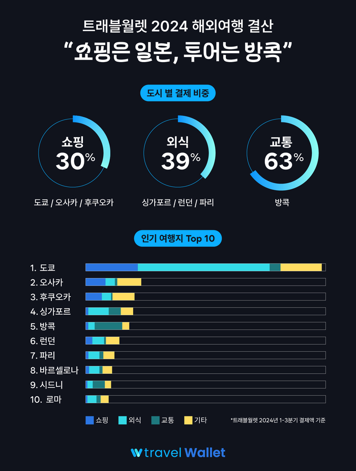 트래블월렛이 2024년 1~3분기 트래블페이 결제 데이터를 분석한 결과,일본이 가장 인기 있는 여행지로 꼽혔다고 10일 밝혔다. <자료=트래블월렛> 외화결제 핀테크 기업 트래블월렛이 2024년 1~3분기 트래블페이 결제 데이터를 분석한 결과,일본이 가장 인기 있는 여행지로 꼽혔다고 10일 밝혔다. 여행객 결제액이 가장 컸던 도시는 도쿄이고,이어 오사카,후쿠오카가 뒤를 이었다. 다음으로 싱가포르와 방콕,런던,파리,바르셀로나,시드니,로마가 주목할 만한 여행지로 나타났다. 방콕은 날씨가 선선해지는 3분기에 수요가 집중되는 특징을 보였다.