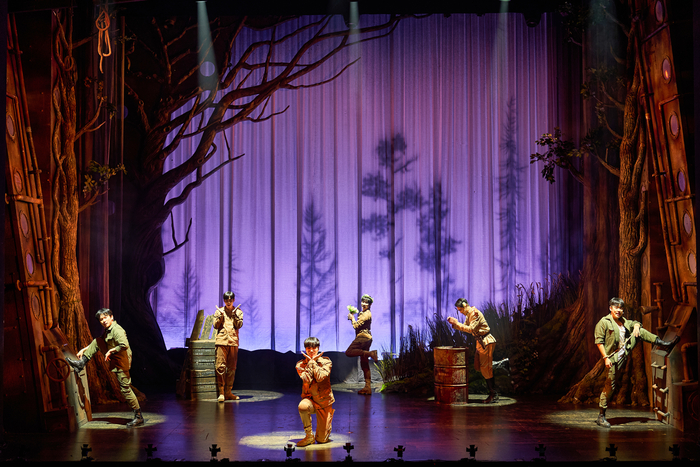 미디어아트의 다양한 색감과 오브제를 활용해 무대를 풍성하게 꾸몄다. 나뭇잎으로 만든 고깔모나 꽃가지 소품은 전쟁 속 희망을 상징한다. 내년 3월 3일까지 서울 대학로 인터파크 유니플렉스 1관.