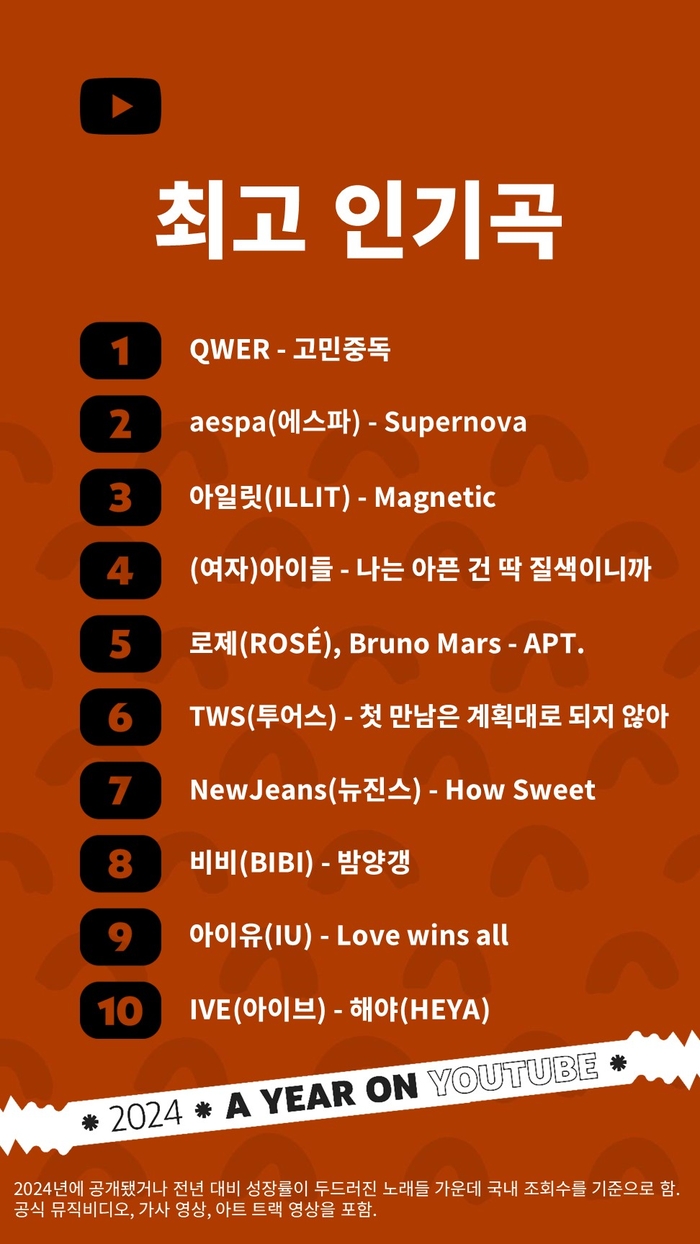 유튜브 한국 최고 인기곡 순위 [유튜브] 2024년 올 한 해 유튜브 한국의 최고 인기곡은 QWER의 ‘고민중독’인 것으로 조사됐다. 로제와 브루노 마스의 ‘APT.’는 5위를 기록했다.