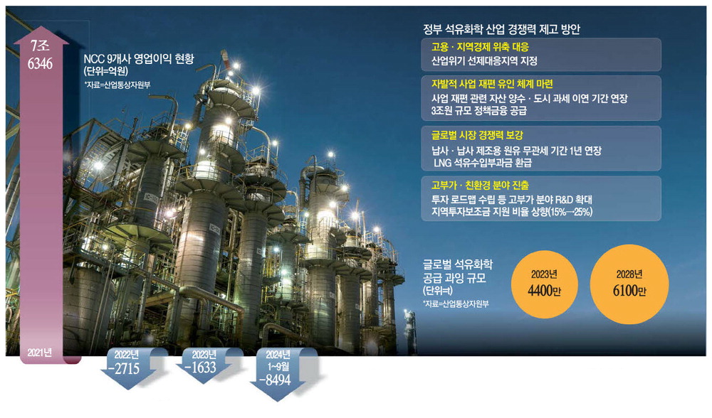 게다가 2018년부터 중국이 석유화학 자급을 목표로 대규모 증설에 나섰고,중동마저 탈석유 시대를 준비한다는 이유로 석유화학 시설에 대한 대규모 투자를 단행했다. 이에 따라 지난해 4400만t이었던 글로벌 공급 과잉 규모는 2028년 6100만t까지 늘어날 것으로 예상된다. 이는 한국 전체 석유화학 설비의 5배에 달하는 물량이다.