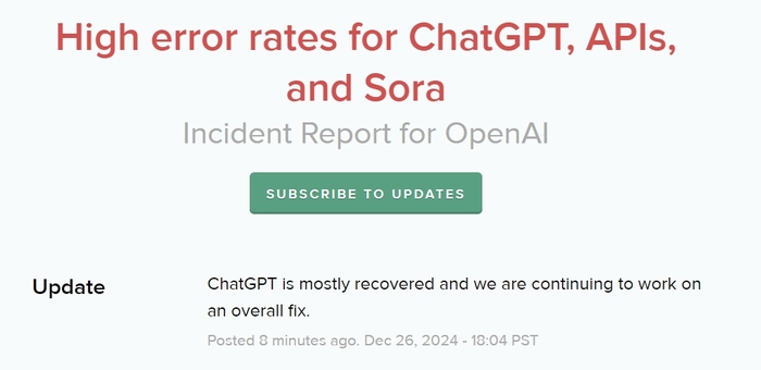 26일(현지시간) 외신과 업계에 따르면 오픈AI의 챗GPT와 소라,오픈AI의 개발자용 API가 26일 오전 11시(한국시간 27일 오전 4시)부터 7시간 이상 먹통이 되는 현상이 벌어졌다. 오픈AI는 장애 발생 4시간 뒤 소라,5시간 뒤 API가 정상화됐다고 공지했다. 이어 “챗GPT는 대부분 복구됐으며 전반적인 수정 작업을 계속하고 있다”고 밝혔다.