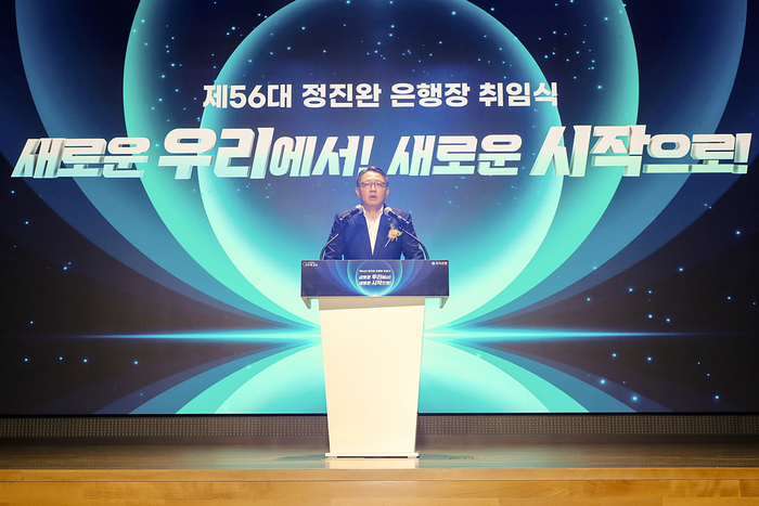 31일 서울 중구 우리은행 본점에서 열린 취임식에서 정진완 우리은행장이 3대 핵심 경영 방침을 밝혔다.
