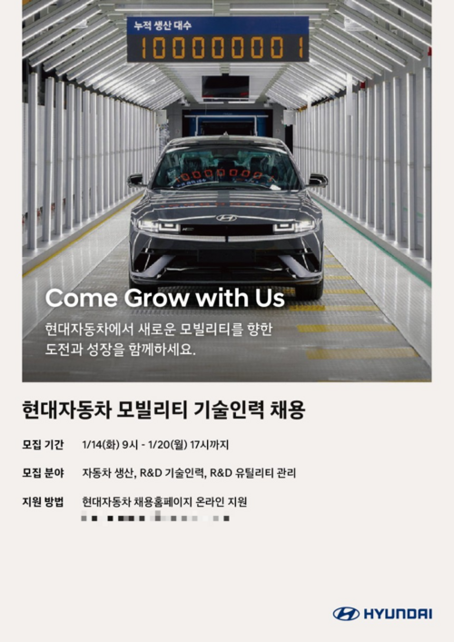이번 채용에서는 △자동차 생산 △연구개발(R&D) 기술인력 △R&D 유틸리티 관리 등 3개 부문에서 인재를 모집한다.