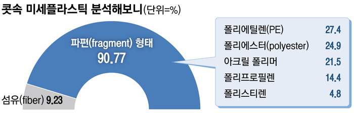 비강 점막 조직 속에 있는 미세플라스틱 조각을 현미경으로 본 모습. 붉은 X 표시가 메스플라스틱 조각이다. [사진 제공 = 중앙대병원] 사람의 콧속에 미세플라스틱이 존재한다는 사실을 국내 연구진이 세계 최초로 규명했다. 평소 호흡을 할 때 공기 중에 존재하는 미세플라스틱이 콧속으로 유입되고,이렇게 들어온 미세플라스틱이 코털,비인두 등에 100여 개씩 쌓여 있다는 분석이다.7일 중앙대병원에 따르면 민현진 이비인후과 교수와 정진영 한국생명공학연구원(KRIBB) 박사 연구팀은 최근 인간의 비강 조직 샘플에서 미세플라스틱을 식별하고 화학적 특성을 분석한 논문을 발표했다. 이번 논문은 이비인후과 부문 최고 저널인 SCIE(과학인용색인)급 국제학술지 ‘알레르기 및 비과학 국제포럼(IFAR)’ 최신호에 게재됐다.민 교수는 “해양뿐 아니라 공기 중에 미세플라스틱이 많이 존재한다는 사실은 알려져 있는데,공기 중 미세플라스틱이 사람의 몸속으로 어떻게 들어오는지에 대해선 밝혀지지 않아 연구에 착수하게 됐다”며 “호흡을 담당하는 코가 중요한 통로 역할을 한다고 보고 이곳에 미세플라스틱이 상당 부분 축적됐을 거란 가설을 세웠다”고 말했다.먼저 연구팀은 중앙대병원에서 코 수술을 받기로 한 환자 중 연구 참여에 동의한 대상자들에게서 수술 전 코털과 중비갑개(가운데코선반),하비갑개(아래코선반),비인두액,중비강액 부위의 샘플을 각각 채취했다. 이후 현미경으로 분석한 결과 비강 샘플 10개의 5가지 부위에서 총 390개의 미세플라스틱이 검출된 것을 확인했다.민 교수는 “사람의 체내 조직은 상당량의 단백질을 함유하고 있는데,정확한 연구를 위해 먼저 여러 분해 효소들을 활용해 단백질을 완전히 제거하는 전처리 과정부터 밟았다”며 “나머지 무기물은 각종 필터를 통해 걸렀고 그 후 현미경으로 샘플을 하나씩 관찰하며 미세플라스틱을 분석했다”고 말했다.구체적으로는 비인두액에서 129개,하비갑개에서 93개,코털에서 86개,중비갑개에서 51개,중비강액에서 31개의 미세플라스틱이 발견됐다. 이들의 90.77%는 파편 형태였고,섬유 재질은 9.23%에 불과했다. 유형별로는 파편 기준 폴리에틸렌이 27.4%로 가장 많았고 폴리에스터(24.9%)와 아크릴 폴리머(21.5%),폴리프로필렌(14.4%),폴리스티렌(4.8%),폴리스티렌 코폴리머(2.8%),폴리에틸렌 폴리프로필렌 코폴리머(2%),폴리우레탄(1.1%) 등이 뒤를 이었다.민 교수는 “산업화로 인해 플라스틱 사용이 늘면서 미세플라스틱도 더 많이 생성되고 있다”며 “이에 최근 들어선 자연환경에 존재하는 미세플라스틱이 인체 내로 흡수될 가능성과 흡수된 이후 인체 내에 미치는 영향에 많은 관심이 쏠리고 있다”고 말했다.연구팀은 콧속 미세플라스틱이 인체에 구체적으로 어떤 영향을 미치는지 후속 연구를 진행할 계획이다. 민 교수는 “콧속 미세플라스틱의 존재를 밝혀낸 1차 연구에서 더 나아가 해당 미세플라스틱이 어떤 독성을 갖고 있는지,인체에 유의미한 영향을 주는지 혹은 그렇지 않은지 등에 대해 추가로 살펴볼 것”이라며 “현재 정확한 검증을 위해 가설과 실험을 설계하고 있다”고 말했다.■ <용어 설명>▶ 미세플라스틱 : 직경이 1마이크로미터(㎛·100만분의 1m)~5㎜ 크기의 플라스틱으로,폐플라스틱이나 비닐,합성섬유 등이 마모·분해되거나 잘게 부서진 조각들이다. 우리 몸에 미세플라스틱이 들어오면 소화기관에서 흡수된 뒤 혈액과 장기에 축적돼 염증 반응이나 세포 손상을 일으킨다. 과도하게 쌓인 미세플라스틱이 내분비계 교란 물질로 작용하면 성장과 생식 건강에도 악영향을 미칠 수 있다.