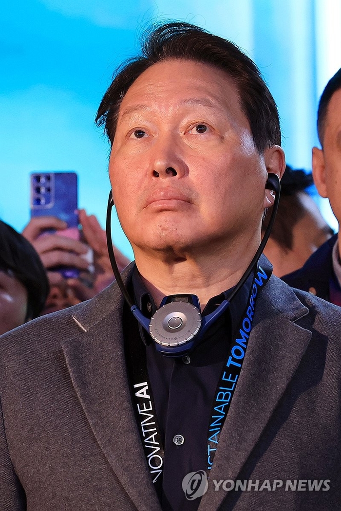 최 회장은 SK 부스에서 SKC 유리 기판 모형을 들어 올리고 “방금 팔고 왔다”고 웃으며 말했다. 개인 AI 에이전트 ‘에스터’ 시연을 보면서는 AI 파운데이션 모델에 대해 수차례 질문을 던지기도 했다.