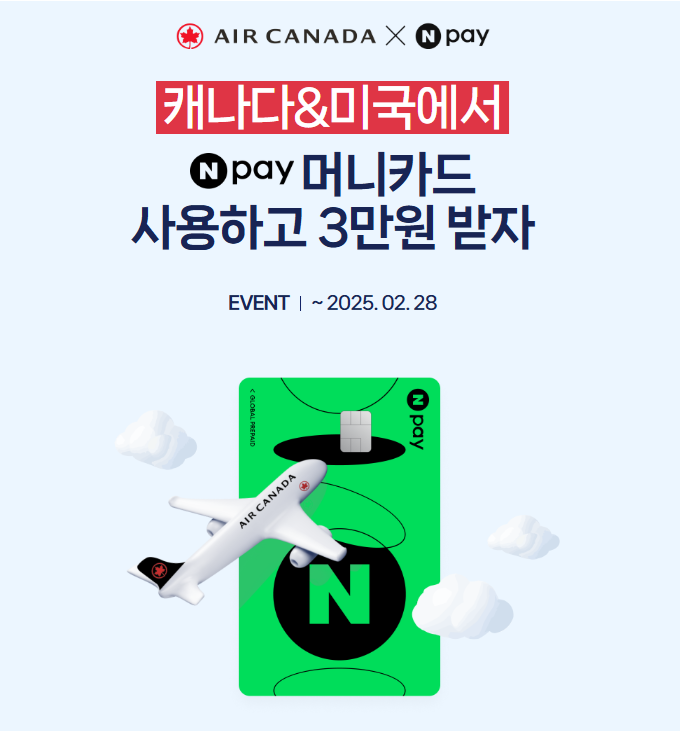 에어캐나다 공식 홈페이지의 신규 이주자 프로그램 페이지를 통해 네이버페이 선불카드인 ‘네이버페이 머니카드’를 발급받은 고객은 발급 후 3개월 내 캐나다와 미국에서 3만 원 이상 결제 시 네이버페이 포인트 3만 원을 적립 받을 수 있다.