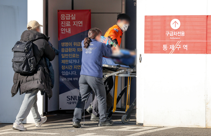 10일 오후 서울 한 대형병원 응급실로 환자가 이송되고 있다. 2025.1.10 [사진 = 연합뉴스] 장기화한 의료 대란에 국민들이 피로감을 호소한 것도 정부가 물러선 주요 배경으로 꼽힌다. 서울대 보건대학원에 따르면 최근 전국 18세 이상 성인 남녀 1000명을 대상으로 실시한 ‘보건의료 개혁 정책에 대한 국민인식 조사’에서 의정 갈등으로 인해 스트레스나 피로감을 느낀다는 응답자는 전체의 70%에 달했다.
