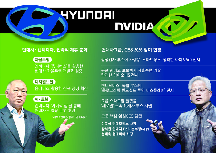 현대차그룹이 10일 미국 라스베이거스에서 열리고 있는 ‘CES 2025’ 현장에서 엔비디아와 전략적 파트너십을 체결했다고 알렸다. 현대차그룹은 현재 진행 중인 차세대 기술 개발에 엔비디아가 보유하고 있는 다양한 AI 기반 플랫폼을 활용하겠다는 뜻을 밝혔다. 2년마다 CES에 전시관을 설치하는 현대차와 기아는 올해 별도 부스를 내지 않았지만 미래 핵심 기술을 확보하기 위해 CES에 찾아가 엔비디아와 손을 잡은 것이다.