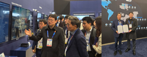<사진설명 = 왼쪽 사진,이성준 피아스페이스 기술총괄 부사장이 이학재 인천국제공항공사 사장에게 솔루션을 설명하고 있다. 오른쪽 사진,미국 라스베이거스 CES 2025에서 체결된 양해각서(MOU) 모습> MOU에 따라 인천국제공항공사는 보안관제 신기술 및 프로젝트 공동발굴을 위한 테스트베드를 제공한다. 피아스페이스는 PoC를 수행하며 자사의 멀티모달 인공지능 기반 실시간 영상분석 기술을 인천국제공항에 적용해 안전 체계의 디지털 전환과 고도화를 추진한다.