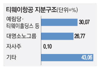 대명소노그룹은 이달 초 항공사업 진출과 시너지 효과를 내기 위해 사내 전담 조직 '항공사업 TF'를 발족했다고 14일 밝혔다. 해당 TF는 티웨이항공 경영권 인수를 염두에 두고 꾸려진 것으로 전해졌다. 현재 티웨이항공 최대주주인 티웨이홀딩스·예림당(지분율 30.07%)과 2대주주 대명소노그룹(26.77%) 간 지분율 차는 약 3%포인트에 불과하다.