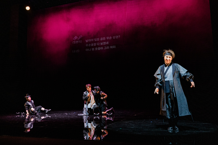 여성국극을 소재로 한 창작산실 올해의 신작 ‘벼개가 된 사나히’. ⓒ유경오 ‘벼개가 된 사나히’의 1막에서 소년은 니마이(미남 남자 주연),산마이(코미디 담당 배역),가다끼(악역) 등 여성국극의 전통적 배역을 경험하고,특히 여러 종류의 젠더 연기를 수행하며 성 역할의 전복을 시도한다. 제작진은 여성 배우가 남역을 연기하던 1940~1960년대 여성국극의 세계관을 현 시대로 확장하기 위해 ‘벼개’(베개),‘사나히’ 등 당대의 언어로 제목과 대사를 표기했다. 2막에서는 설화 ‘아랑애사’의 인물 아랑과 버들을 등장시켜 전통 시대에 존재했던 젠더 폭력을 풀어낸다.