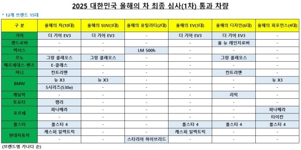 2025 대한민국 올해의 차 최종 심사 1차 평가를 통과한 차량은 브랜드별로 보면 BMW,포르쉐,현대자동차(브랜드 가나다 순)가 각각 2대였고,기아,랜드로버,렉서스,르노,메르세데스-벤츠,MINI,캐딜락,토요타,폴스타가 각 1대씩이었다.
