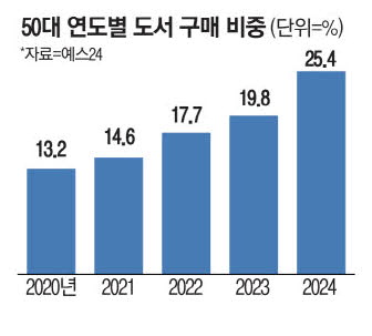 50대가 출판시장의 다크호스로 떠오르고 있다. 예스24 통계에 따르면 50대 구매자는 2022년 전체의 17.7%,2023년 19.8%,지난해 25.4%로 계속 우상향 곡선을 그리고 있다. 20대와 30대 비중은 각각 11.2%와 15.3%에 그쳤다. 교보문고 수치도 크게 다르지 않다. 2019년 12.8%였던 50대 비중은 지난해 15.5%로 확대됐다.