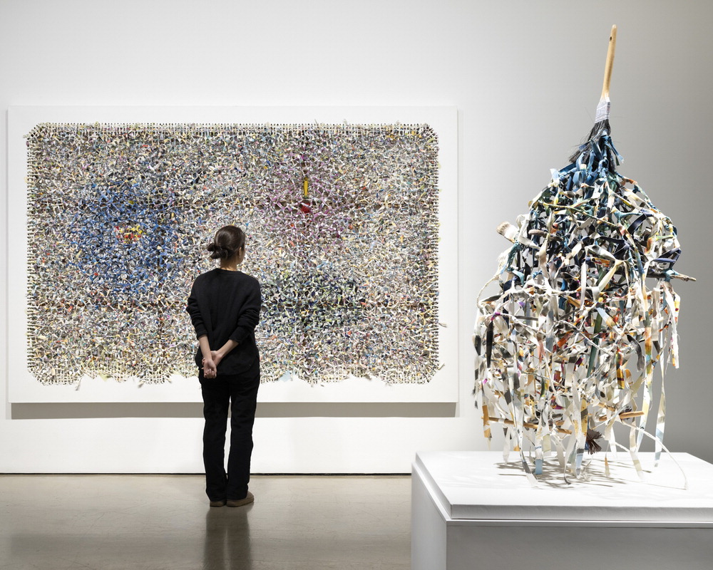 가늘고 길게 잘린 캔버스 천 조각들이 얼기설기 얽혀 입체적인 오브제를 이루고 있다. 어떤 것은 철근 같은 구조물을 붕대처럼 꽁꽁 감싸고,또 어떤 것들은 매듭을 이루며 엮여 있다. 평생 회화의 다양한 가능성을 모색했던 신성희 화백(1948~2009)이 캔버스 위에 그린 추상화 여럿을 해체하고 다시 재조합해 만든 '회화로부터'(2009)다. 회화로부터 비롯된 작품이지만 조각과 설치를 넘나드는 이 작품의 맨 꼭대기에는 신 화백이 그림을 그릴 때 사용했던 붓이 세워져 있고,붓끝에서는 파란 물감이 아래로 흘러내리는 듯하다.
