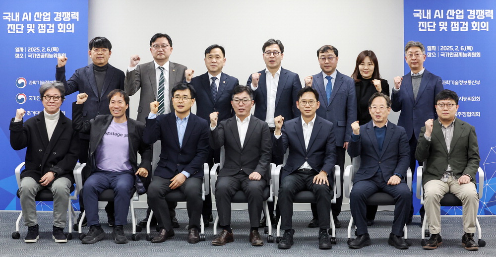 6일 서울 중구 서울스퀘어에서 과학기술정보통신부 주최로 열린 '국내 인공지능(AI) 산업 경쟁력 진단 및 점검 회의' 참석자들이 기념촬영을 하고 있다. 이 회의에는 강도현 과기정통부 제2차관(뒷줄 왼쪽 셋째)을 비롯해 조준희 한국소프트웨어산업협회장,김유원 네이버클라우드 대표,배경훈 LG AI연구원장,김병학 카카오 부사장 등이 참석했다. 뉴스1