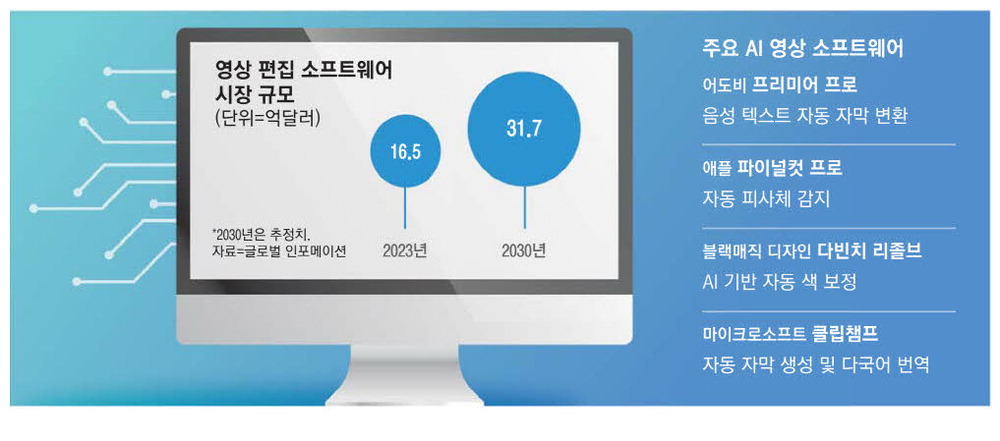동영상 콘텐츠 산업이 성장하면서 인공지능(AI)을 활용한 영상 편집 소프트웨어가 고도화되고 있다. AI가 영상 프레임을 인식해 편집자가 원하는 영상을 찾아주거나 다국어 자막을 자동으로 제작하면서 콘텐츠 제작 효율을 대폭 높이고 있다. 시장조사기관 '글로벌 인포메이션(GII)'에 따르면 2023년 24억3000만달러 수준이었던 영상 편집 소프트웨어 시장은 연평균 9.7% 성장해 2030년까지 31억7000만달러로 성장할 것으로 예상된다.