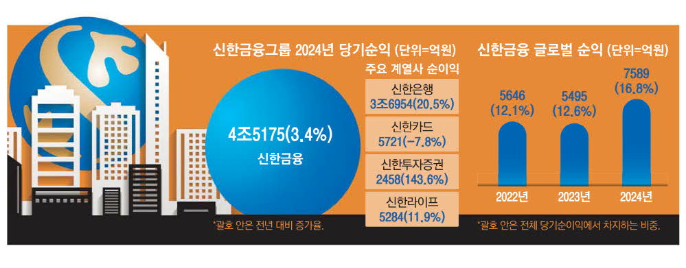 6일 신한금융그룹은 2024년 한 해 4조5175억원의 당기순이익을 거뒀다고 밝혔다. 이는 견고한 해외 실적이 뒷받침했다. 그룹 당기순이익 내 해외 비중은 16.8%까지 높아졌다. 2023년 12.6%에 비해 4.2%포인트 올라갔다. 신한베트남은행이 직전 연도 대비 13.4% 늘어난 2640억원을,일본 법인인 SBJ은행이 전년보다 17% 증가한 1486억원을 벌었다. 두 법인 모두 역대 최고 실적을 기록했다.