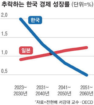 KDI에 따르면 2023~2030년 1.9%로 예상되는 경제성장률은 2031~2040년 1.3%로 하락할 전망이다. 이 시기 노동 투입의 성장 기여도는 -0.3%로 마이너스 전환한다. 2041~2050년에는 노동 투입 기여도가 -0.7%로 떨어지고,경제성장률은 0.7%로 뚝 떨어진다.
