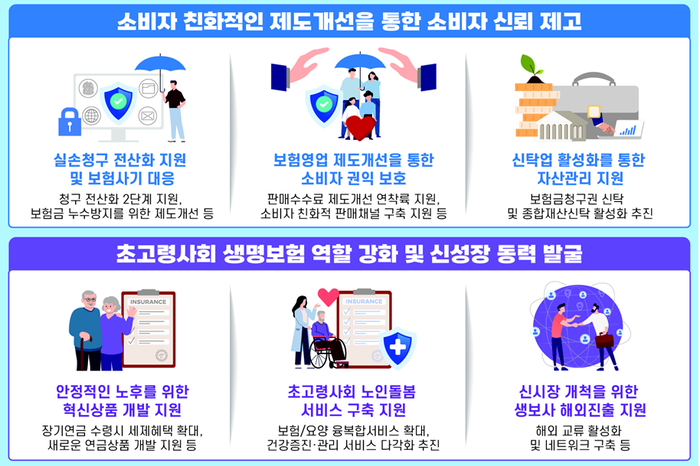 이와 함께 초고령사회의 생명보험 역할을 강화하기 위한 특화상품과 돌봄서비스도 확충한다. 초고령시대에 맞는 연금상품 등을 개발 지원하며 장기수령 땐 세제혜택 등을 추진한다.