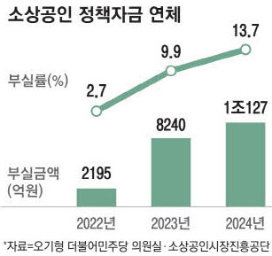 소상공인 정책자금 중 직접대출 부실률은 은행 등 금융기관을 통하지 않고 소진공이 직접 대출해 준 자금 중 3개월 이상의 연체·기한이익상실 금액 비중을 의미한다. 소상공인 정책자금 부실률은 2022년 말 기준 2.7%에서 2023년 말 9.9%로 급증한 후 지난해엔 13%를 넘어섰다. 부실금액 역시 2022년 말 기준 2195억원에서 작년 말엔 5배 가까이 늘었다. 소상공인 정책자금 누적 대출잔액은 2022년 13조4583억원에서 2024년 12조8550억원으로 감소했으나 부실률은 더 높아진 셈이다.