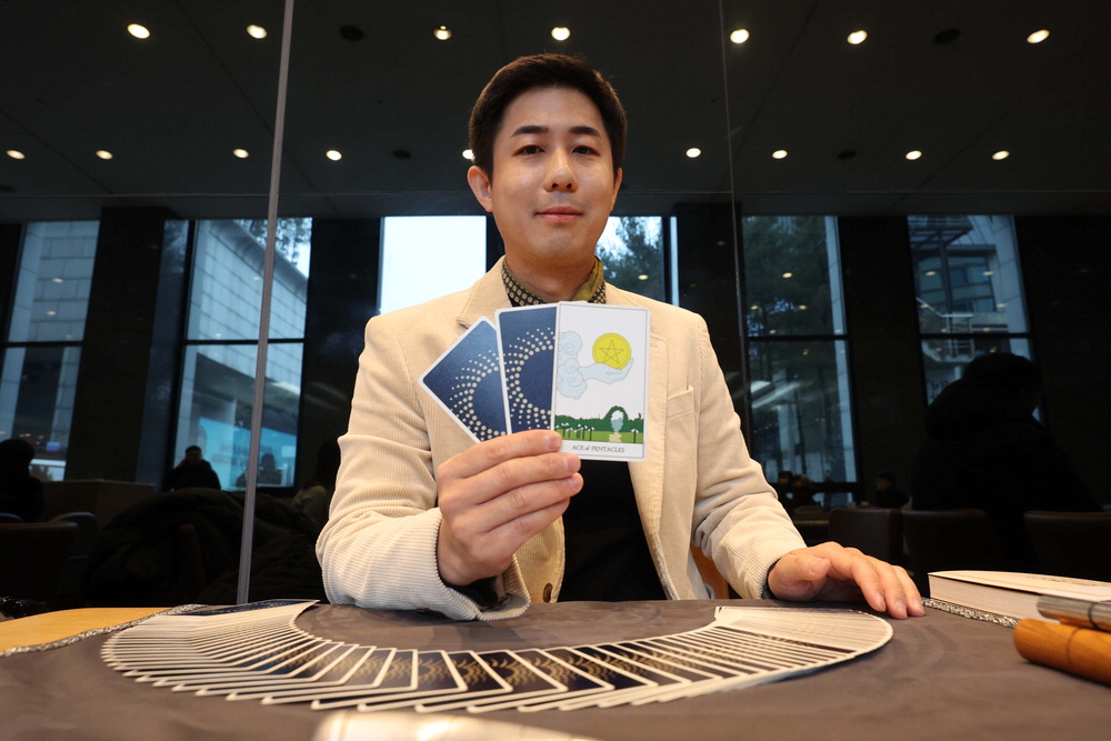 정회도가 최근 매일경제신문을 방문해 타로카드를 뽑아들고 있다. 한주형 기자