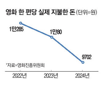 영화진흥위원회가 최근 발표한 '2024년 한국영화 결산'에 따르면 지난해 영화 1편당 평균 관람 요금은 9702원으로 전년(1만80원)보다 3.8% 낮아졌다. 관객들이 멀티플렉스 3사의 주말 일반영화 성인 관람권 정가(1만5000원) 대비 64.7%만 실제로 지불한 것이다. 영화 티켓값이 코로나19 기간 대폭 인상됐지만 실질적으로 낸 돈은 쪼그라드는 기현상이 발생했다. 평균 관람 요금은 2022년에 1만285원으로 처음 1만원을 넘어섰다가 2년 연속 하락했다.