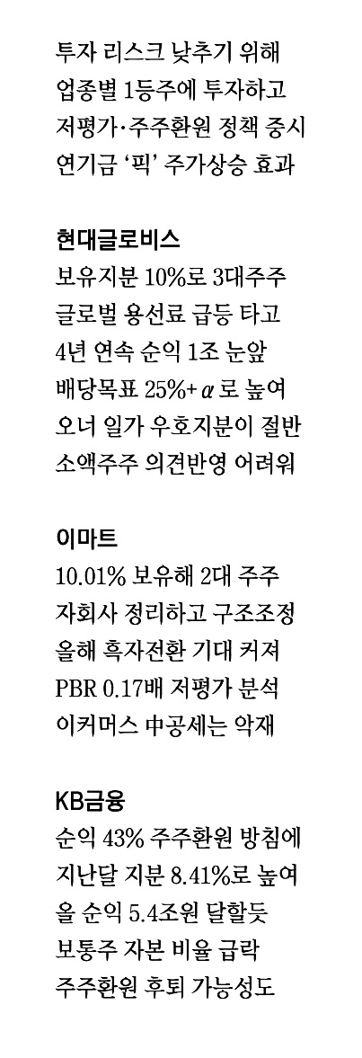 3월 주주총회 시즌이 다가올수록 국민연금의 '캐스팅보트'(승패를 결정하는 제3자) 역할도 중요해진다. 현대글로비스와 이마트의 경우 그룹 총수 지분율이 20%대인데 국민연금은 10%라는 지분율로 오너의 전횡을 막는다. KB금융의 경우 최대주주가 국민연금으로서 주주환원을 이끌어낼 교두보다.