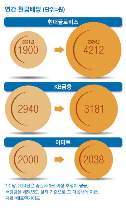 2021년 주당 1900원이었던 연간 현금배당은 2023년 기준 3150원에 이어 2024년도엔 4212원으로 추정된다. 배당성향은 18~22% 수준이었는데 이를 25%까지 높이겠다는 뜻이다. 작년 6월엔 공짜로 주식을 추가 배정하는 무상증자도 단행했다. 주가는 저평가 상태다. 작년 말 주가수익비율(PER)은 9.05배였는데 향후 12개월 예상 순익 기준으로는 6.46배까지 낮아진다.