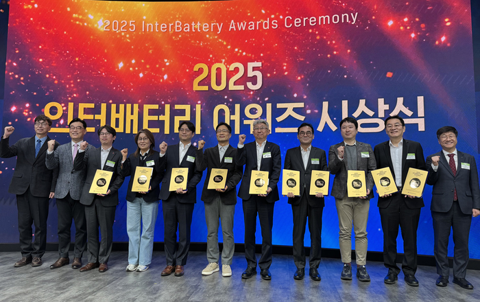 (서울=연합뉴스) 강태우 기자 = 24일 서울 강남구 코엑스에서 열린 ‘인터배터리 어워즈 2025’ 시상식에서 수상자들이 기념 촬영하고 있다. 2025.2.24